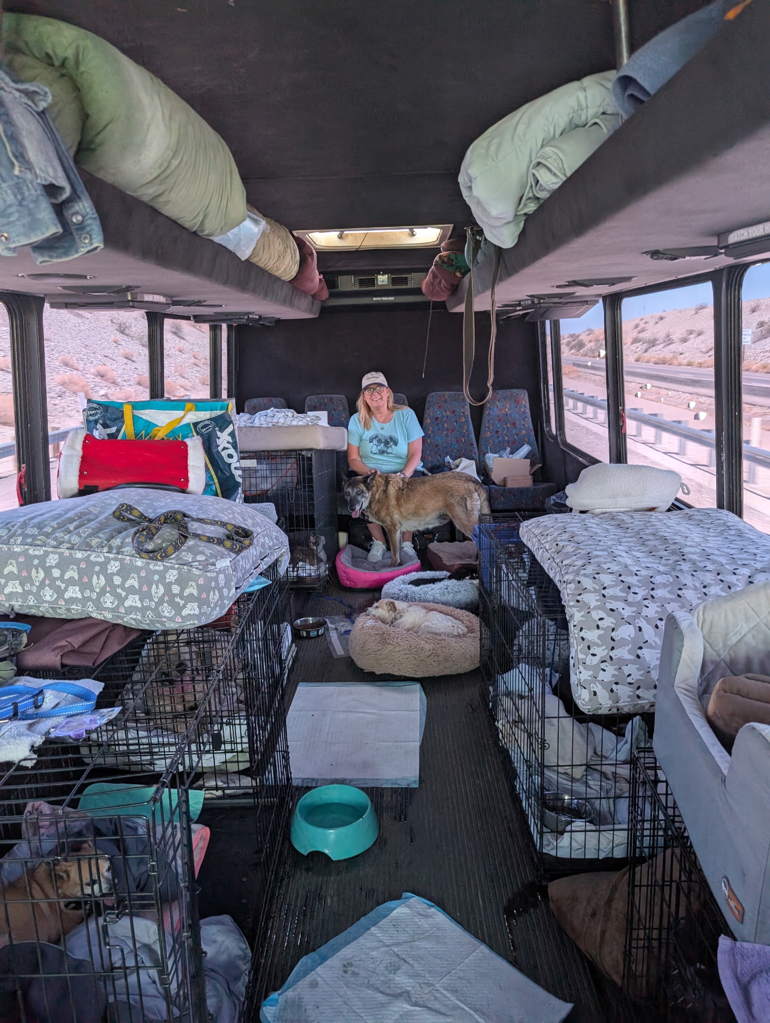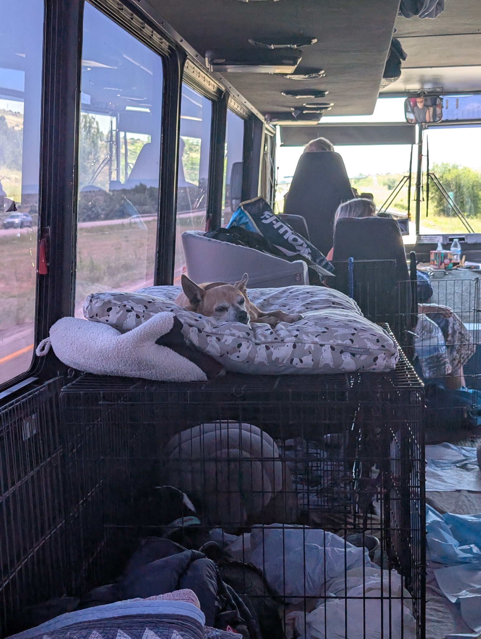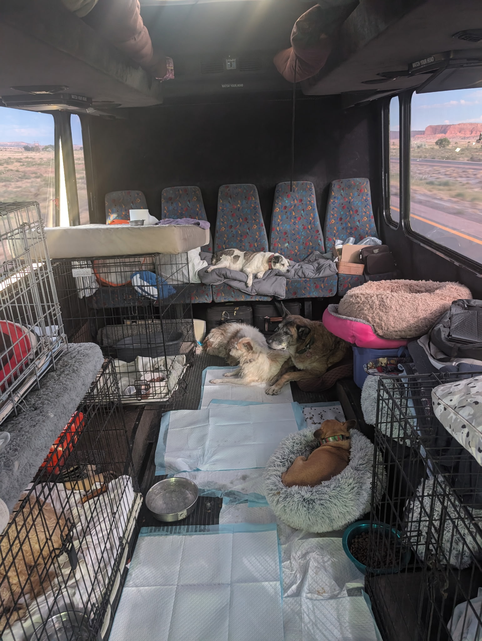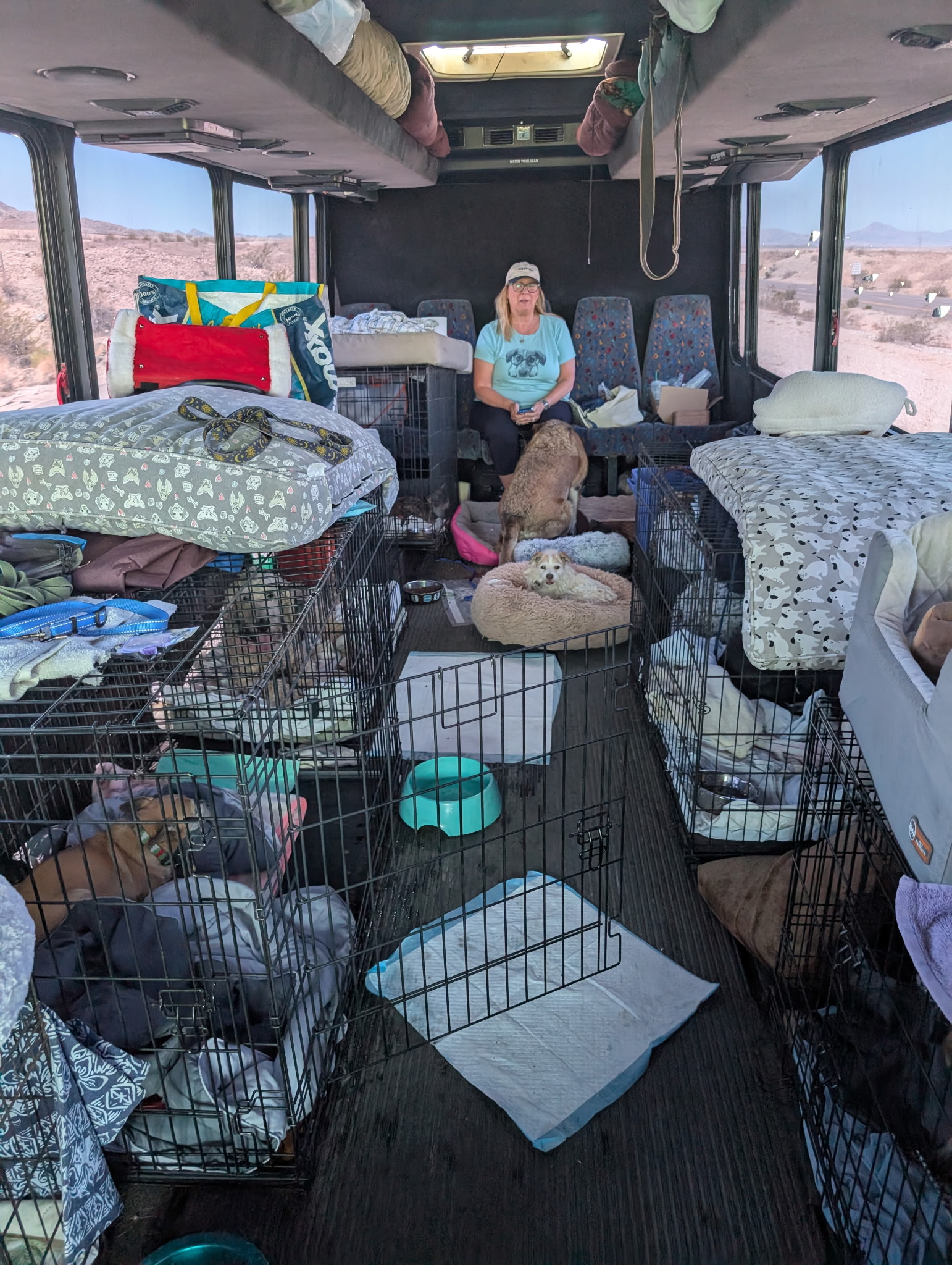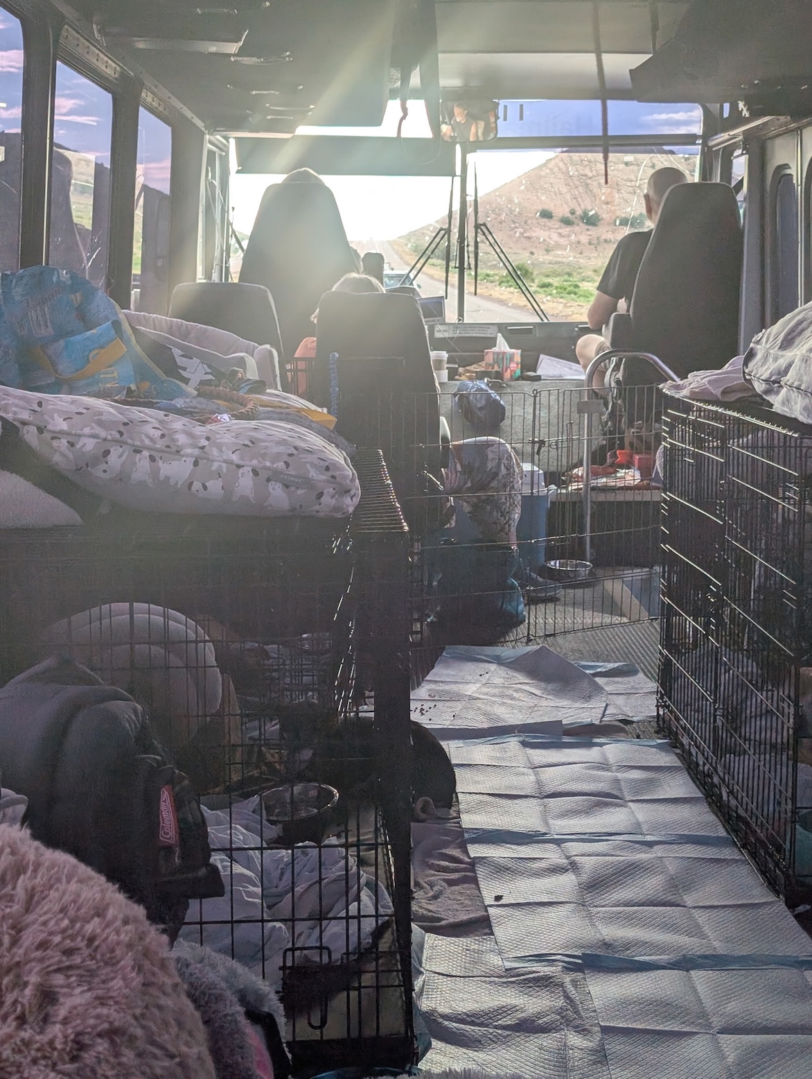Helped with last minute loading by Sheila & Jeff K, Chris K, Patty O, Lisa B, and Stephanie A, we bid farewell to our years in Creston as 4 vehicles ambled east on a journey that would take 180 hours out of the lives of Chris Crofford, Kay Desmond, Susan and Bill Massey, Lori Hernandez, Teresa Rhyne, Tim Furman, Charlotte Meade, Cat and 33 dogs.