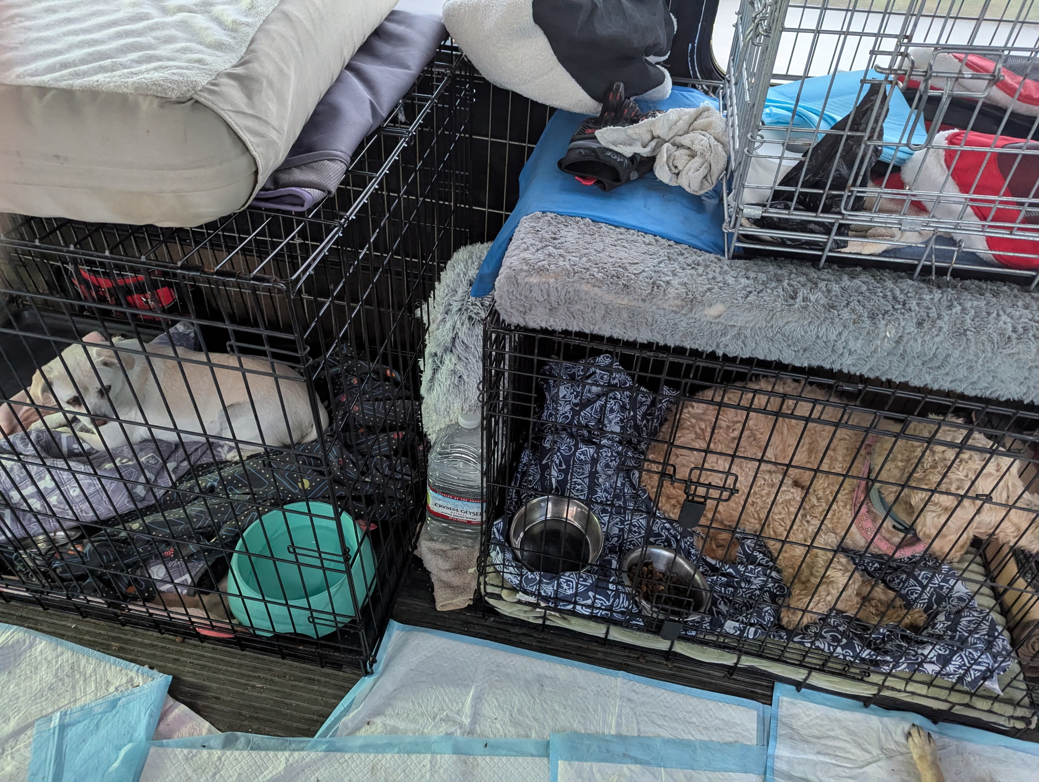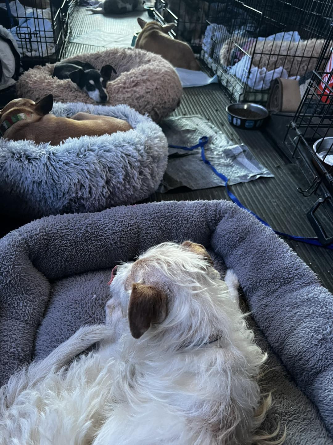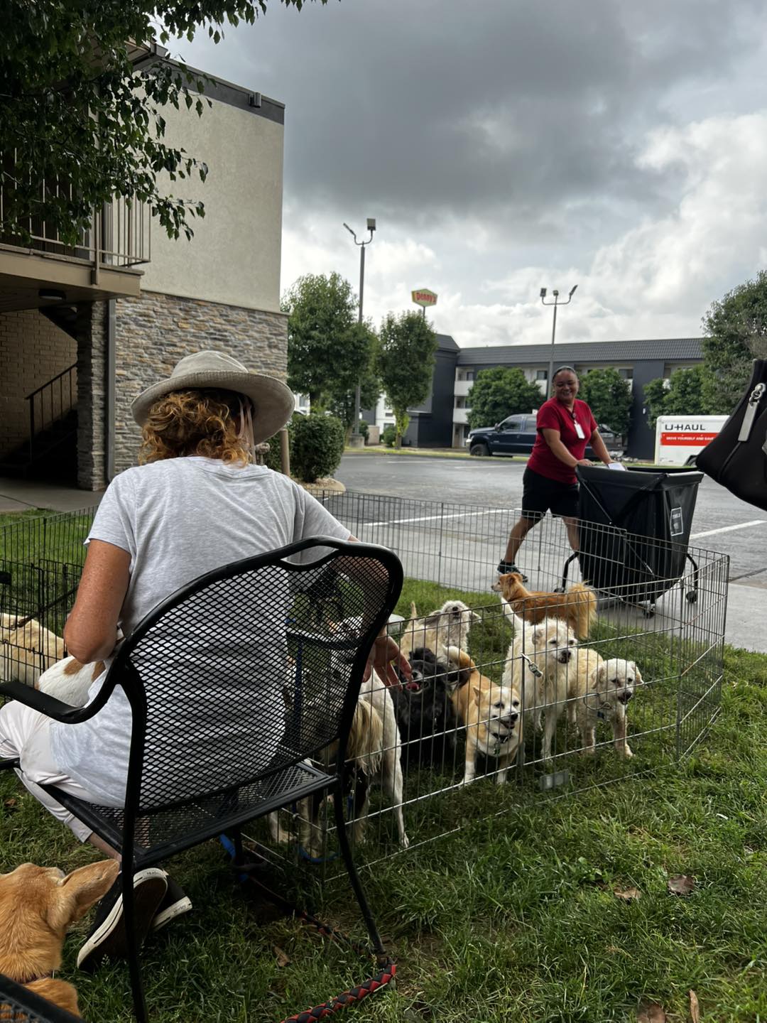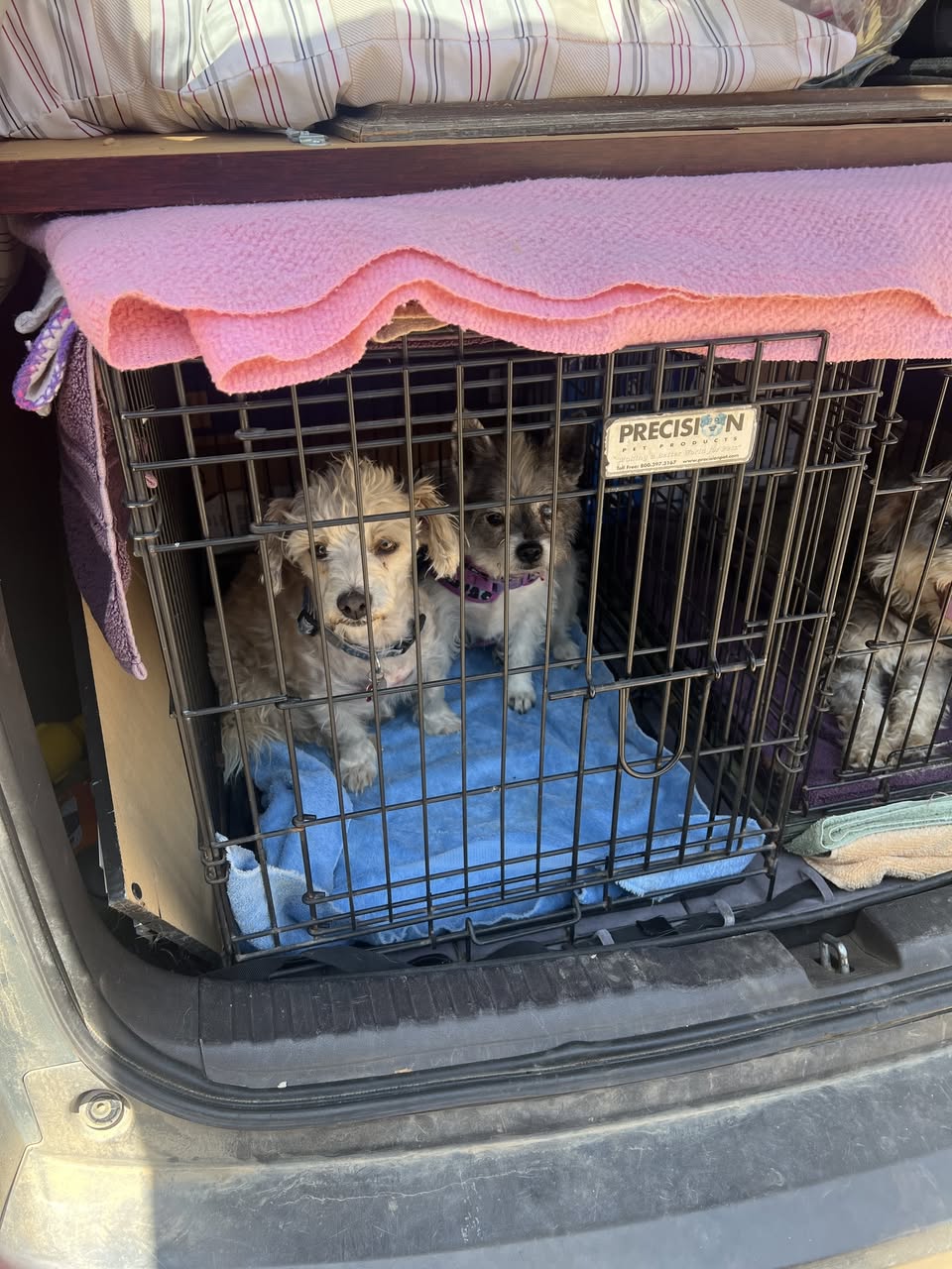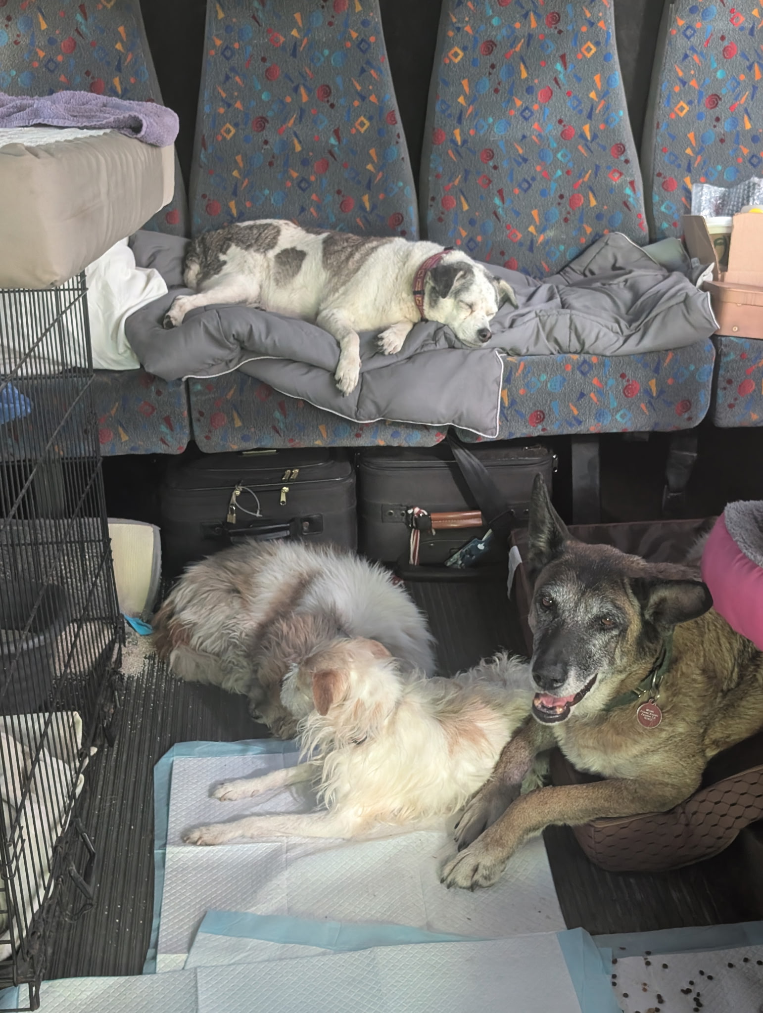 Helped with last minute loading by Sheila & Jeff K, Chris K, Patty O, Lisa B, and Stephanie A, we bid farewell to our years in Creston as 4 vehicles ambled east on a journey that would take 180 hours out of the lives of Chris Crofford, Kay Desmond, Susan and Bill Massey, Lori Hernandez, Teresa Rhyne, Tim Furman, Charlotte Meade, Cat and 33 dogs.